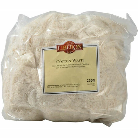 Liberon Cotton Waste is made from pure cotton strands that are used as wadding inside French polishing rubbers. For use with Liberon Cotton Rags to make French polishing rubbers. They are easy to shape and mould to size and allow French polish to flow evenly.